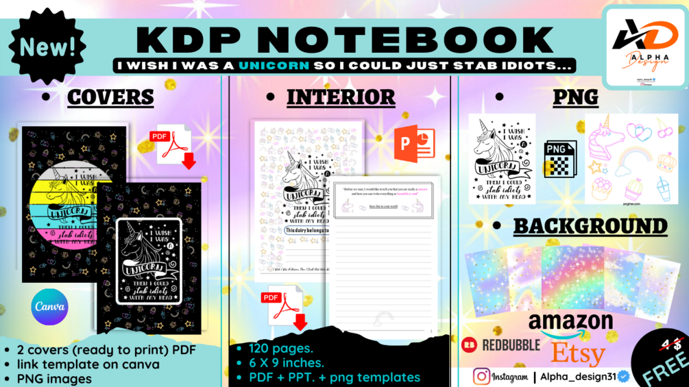 Unicorn Notebook journal ( covers + interior ) for kdp 6x9 inches + Background